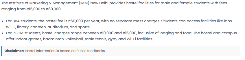 Institute of Marketing Management proide hostel facility for its PGDM students in affordable fee, this includes WIFI, Meals, etc. Read more